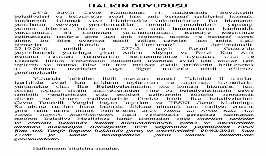 İşyerleri Evsel Katı Atık Ücret Tarifesi Duyurusu İşyerleri Evsel Katı Atık Ücret Tarifesi Duyurusu All